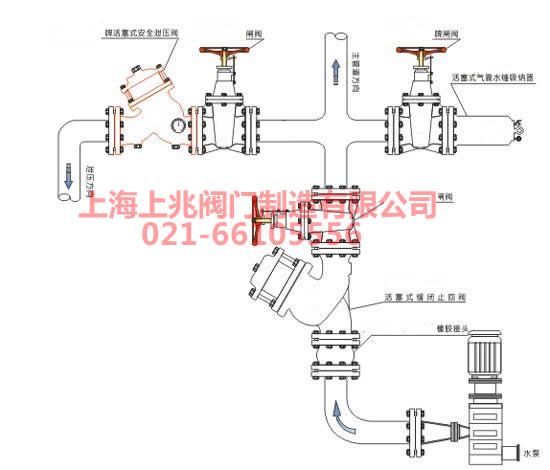 六、YQ98002型过滤活塞式安全泄压阀--安装方式及连接要求: 一、根据工况的减压特性,必须在该阀前安装 闸阀; 二、方便日后对该阀进行检修工作.必须在减压阀后安装可曲绕软连接; 三‘最佳安装方式为卧式,其它方位也可以接受; 四、必须留出足够的工作空间方便检修; 五、吊装时采用有效措施进行.也可利用该阀吊环进行。 七、YQ98002型过滤活塞式安全泄压阀--安装图: