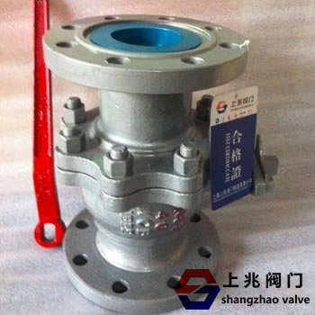 氨用球阀与普法兰式球阀相同。启闭件为一个球体, 液氨紧急切断阀利用球体绕阀杆的轴线旋转90度实现开启和关闭的目的。主要由阀体、球体、阀座、阀杆、手柄等部件组成。Q41B氨用球阀采用铸钢二段法兰式,由右阀体与左阀体组合为一体。左阀体为法兰管形与左阀体碗面相配,内部各置配一阀座密封圈,在它们之间夹紧一个球体,球体上有通孔,通孔的直径等于管道的内径。