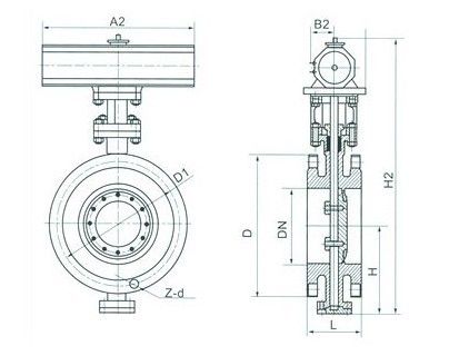 三、D643H 气动法兰硬密封蝶阀--主要连接及外形尺寸 公称通径 DN | 结构长度L | 外形尺寸(参考值) | 连接(标准值) | 参考 重量Dt343H | | H | Dt343H | PN0.6MPa | PN1.0MPa | | mm | inch | 短 | 长 | H1 | A1 | B1 | D | D1 | z-d | D | D1 | z-d | | 50 | 2 | 108 | 150 | 112 | 350 | 180 | 200 | 140 | 110 | 4-14 | 165 | 125 | 4-18 | 17 | | 65 | 5/2 | 112 | 170 | 115 | 370 | 180 | 200 | 160 | 130 | 4-14 | 185 | 145 | 4-18 | 20 | | 80 | 3 | 114 | 180 | 120 | 380 | 180 | 200 | 190 | 150 | 4-18 | 200 | 160 | 8-18 | 23 | | 100 | 4 | 127 | 190 | 138 | 420 | 180 | 200 | 210 | 170 | 4-18 | 220 | 180 | 8-18 | 25 | | 125 | 5 | 140 | 200 | 164 | 460 | 180 | 200 | 240 | 200 | 8-18 | 250 | 210 | 8-18 | 40 | | 150 | 6 | 140 | 210 | 175 | 555 | 270 | 280 | 165 | 225 | 8-18 | 285 | 240 | 8-22 | 47 | | 200 | 8 | 152 | 230 | 208 | 605 | 270 | 280 | 320 | 280 | 8-18 | 340 | 295 | 8-22 | 60 | | 250 | 10 | 165 | 250 | 243 | 680 | 270 | 280 | 375 | 335 | 12-18 | 395 | 350 | 12-22 | 95 | | 300 | 12 | 178 | 270 | 283 | 800 | 380 | 420 | 440 | 395 | 12-22 | 445 | 400 | 12-22 | 124 | | 350 | 14 | 190 | 290 | 310 | 835 | 380 | 420 | 490 | 445 | 12-22 | 505 | 460 | 16-22 | 181 | | 400 | 16 | 216 | 310 | 340 | 915 | 450 | 470 | 540 | 495 | 16-22 | 565 | 515 | 16-26 | 260 | | 450 | 18 | 222 | 330 | 380 | 960 | 480 | 490 | 595 | 550 | 16-22 | 615 | 565 | 20-26 | 338 | | 500 | 20 | 229 | 350 | 410 | 1020 | 480 | 490 | 645 | 600 | 20-22 | 670 | 620 | 20-26 | 360 | | 600 | 24 | 267 | 390 | 470 | 1225 | 480 | 660 | 755 | 705 | 20-26 | 780 | 725 | 20-30 | 540 | | 700 | 28 | 292 | 430 | 550 | 1355 | 640 | 660 | 860 | 810 | 24-26 | 895 | 840 | 24-30 | 580 | | 800 | 32 | 318 | 470 | 640 | 1470 | 640 | 660 | 975 | 920 | 24-30 | 1015 | 950 | 24-33 | 845 | | 900 | 36 | 330 | 510 | 710 | 1545 | 750 | 860 | 1075 | 1020 | 24-30 | 1115 | 1050 | 28-33 | 1050 | | 1000 | 40 | 410 | 550 | 770 | 1795 | 850 | 860 | 1175 | 1120 | 28-30 | 1230 | 1160 | 28-36 | 1500 | | 1200 | 48 | 470 | 630 | 890 | 1965 | 850 | 900 | 1405 | 1340 | 32-33 | 1455 | 1380 | 32-39 | 2000 |