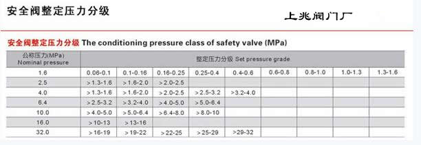 安全阀都有公称压力和整定压力。公称压力是指阀体最大允许承受的压力,如公称压力为PN16、PN25、PN40、PN64等;整定压力是指弹簧在压力的作用下,达到这个设定的压力值时,弹簧即顶起阀杆向外泄压。如整定压力为0.1Mpa、1.2Mpa、2.2Mpa等。公称压力是指的安全阀的耐压等级,也就是说安全阀最高承受的压力。而安全阀整定压力是指安全阀内部达到这个压力就起跳。整定压力是可调的,但是整定压力也存在分级关系,一般是在标准设定的范围内调整。见下图安全阀整定压力分级表: