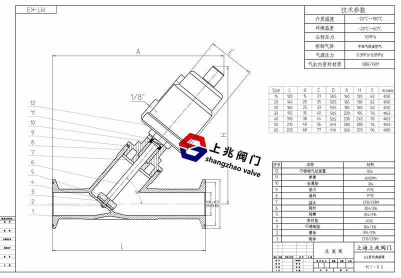 产品介绍 快装气动角座阀(不锈钢头)--工作原理: 在非工作状态时,由于弹簧力作用,阀门常闭(开)。当执行器活塞被压缩气体作用时,阀门打开(关闭)。双作用形式靠压缩气体控制阀门开关。 快装气动角座阀(不锈钢头)--应用范围: 啤酒饮料灌装设备 制药及医疗设备 印染纺织 化工行业 气体工业 高温灭菌 发泡机械 水/污水处理 快装气动角座阀(不锈钢头)--特点: 流量大,流阻小,无水锤 Y型设计,增加30%流量 超长使用寿命 阀杆自动校正,自润滑,免维护 气缸采用不锈钢材质,在恶劣环境中更加优秀,可360°旋转。 快装气动角座阀(不锈钢头)--技术参数: 管道压力:Max1.6Mpa(232psi) 控制压力:0.3-0.8Mpa(43.5-116psi) 控制介质:中性气体或空气 阀体材料:CF8M/CF8(SS316,SS304) 密封材料:聚四氟乙烯 气缸材料:塑料PPS 气缸尺寸:27mm,32mm,40mm,50mm,63mm, 80mm,100mm,125mm 适用介质:水,酒精,油,染料,蒸汽,中性气体或液体,有机溶剂,酸碱溶液 介质温度:-10℃-+180℃,25℃-+220℃ 环境温度:-10℃-+80℃ 控制形式:单作用常闭,???,双作用常闭,双作用自由态 连接形式:螺纹式,焊接式,法兰式,快装式 快装气动角座阀(不锈钢头)图纸: ![]() | ||