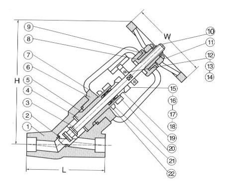 J15Y/J65Y 内螺纹Y型锻钢截止阀有三种阀盖设计形式。第一种是螺栓式阀盖,按这种设计形式设计的阀门,其阀体与阀盖用螺栓螺母连接,缠绕式垫片(316夹柔性石墨制造)密封??突в刑厥庖笫币部刹捎媒鹗艋妨印5诙稚杓菩问绞呛附邮椒Ц?,按这种形式设计的阀门,其阀体与阀盖用螺纹连接,全焊密封。客户有特殊要求时也可采用全焊二连接。第三种为压力自紧式阀盖,按这种形式设计的阀门,其阀体与阀盖用螺纹连接,内压自密封环密封。