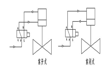 当控制器按事先编好的程序对某个气源换向阀输出一个信号,该换向阀动作,使带压仪表气源通过换向阀的切换进入气动执行机构的气缸上腔或下腔,推动活塞运动使阀们开启或关闭。阀门的操作连接方式(如图所示)。