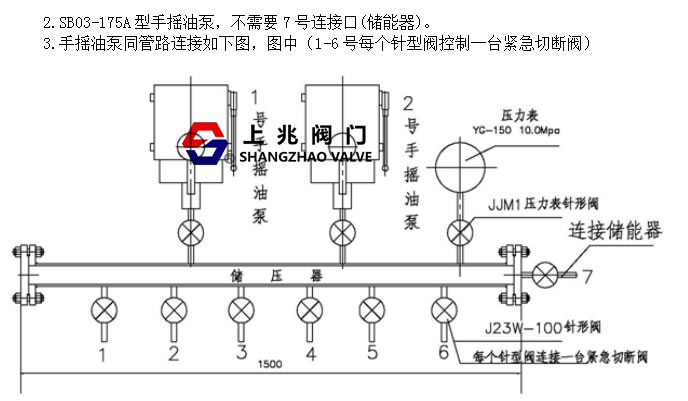 1、手摇油泵通过手柄做往复动作,使压力增高来打压紧急切断阀,介质即可通过。如遇火灾或其它紧急情况时,将手摇油泵的泄压阀打开。油压系统迅速泄压,使紧急切断阀立刻关闭,或温度升高至75℃以上时,安装在油泵或紧急切断阀的易熔塞立刻熔化,达到自动泄压目的,使紧急切断阀迅速关闭。