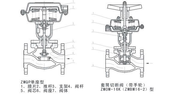 3、 主意务必按ZMQM气动薄膜套筒切断所示的介质流动方向(阀体上的箭头)安装电动单座调节阀。