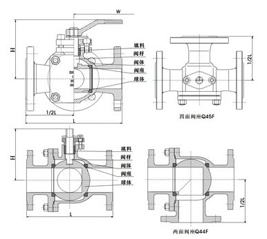 Q44 法兰连接三通球阀可分为L形和T形,L形(Q44F)三通球阀用于介质流向的切换,能使相互垂直的两个通道连接;T形(Q45F)三通球阀用于介质分流、合流及流向切换。T形三通可以使三个通道相互连通或使其中的两个通道连通。三通球阀一般采用两阀座结构,亦可根据用户要求采用四阀座结构。