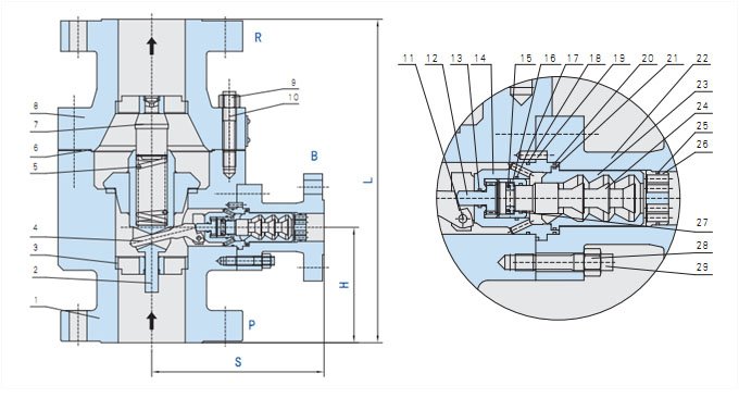 产品介绍 一、自动回流三通阀产品概述: ZDM/ARC1000 自动回流三通阀是一个独立的多功能控制系统,能够动态的感知主流道的变化,随主流道调节旁路介质流量,它积极了截止阀,止回阀,多级调节阀减压阀功能于一身。自动再循环阀安装于锅炉给水泵出口、对给水泵起安全?;ぷ饔?。泵?;し?它)用于防止给水泵的低负荷运行时由于过热、严重噪音,不稳定汽蚀引起损坏。 二、自动回流三通阀工作原理: ZDM/ARC1000自动回流三通阀介质经过阀门入口进入阀体,阀芯同时也是测量部件感受到流量通过,当流量小于设定值时,液体通过阀座上的开孔并通过阀杆同时也是旁路阀芯的减压调节通道做旁路循环。当出口流量大于所设定流量时,流体进入主管道中并逐渐关闭旁路,进行正常流动。 据感应到的主路流量不同,自动再循环泵?;しУ闹鞣О曛够刈督远贫侥骋桓鑫恢蒙稀M敝鞣О甏月贩ХЦ?将主阀瓣动作传递至旁路,通过控制旁路阀阀瓣的位置,改变旁路的节流面积,从而控制通过旁路的流量。当主阀瓣回至阀座关闭状态时,所有流量通过旁路回流。当主阀瓣上升至顶端位置时,旁路则完全关闭,所有泵的流量流向工艺系统。该阀集四种功能于一体。 流量感知:自动再循环阀的主阀瓣能自动感知工艺系统中的主流量,从而根据此流量来确定主阀瓣和旁路阀瓣的位置。 再循环控制:自动再循环泵?;し?/a>可以将泵正常运行所需要的最小流量通过旁路吸入到存储装置中,调节水泵的H-Q特性,实现再循环。 旁路多级减压:旁路控制系统能低噪音小磨损的把回流介质从泵出口的高压减至适宜回流存储装置中的低压。 止回:自动再循环阀还具有止回阀的作用,防止液体回流到泵体中。标准型旁路带止回功能。 其它旁路尺寸可按要求制作;最大的旁路流量取决于最大的Kv值 三、自动回流三通阀性能优势: 1.包括回流的减压设施,使高压介质经多次小通径绕流,消耗大量的能量,而降低压力。 2.只在流量很低时才有回流功能,使泵冷却,在泵正常运行时,并没有回流,从而可节省因连续再循环所消耗的电能和水能。 3.自动回控制阀不需要电气配线,也不需要两个调节阀串联,一个用于调节,另一个用于切断。并把高压系统容易产生的高速流拉线和侵蚀现象减到zui少。 4.具有设计合理,运行平稳,无噪音,寿命长等特点,可完全替代进口产品。 5.阀门应垂直安装。 四、自动回流三通阀结构参数: 1、公称通径:DN40~350 2、公称压力:PN10-PN420 3、旁路尺寸1-8(标准);或特殊 4、推荐流速:4~6米/秒 zui高8米/秒 5、连接方式:法兰连接(ANSI或DIN) 6、铸碳钢,锻碳钢,铸铬镍钼铍不锈钢,锻铬镍钼铍不锈钢 五、自动回流三通阀结构图 :![]() | ||