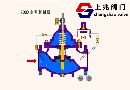 700X多功能水泵控制阀由主阀、电磁导阀、针阀、球阀、单向阀、行程开关、微形过滤器和压力表组成水力控制接管系统。水泵需停止工作时,先由进口压使主阀关闭90%后,水泵停止运转。剩余10%由回水关闭??煞乐顾赶窒蠓⑸?。本产品利用电磁导阀控制,不需要其它装置和能源。节约能源,保养简便,停泵平稳。电磁阀可采用交流电220V或直流电24V。 二、700X多功能水泵控制阀--工作原理