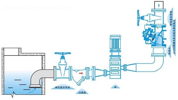 JD745X多功能水泵控制阀的接管系统采用调节阀控制,通过设定调节阀的开度,可方便实现需要的各项控制参数,如主阀的开启速度、缓闭速度等等。