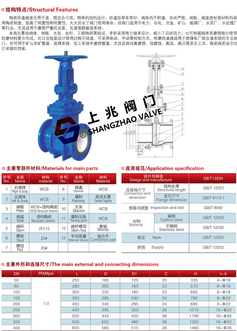 产品介绍 PZ41TC手动陶瓷排渣阀--产品介绍: 1、 密封副采用高性能工程结构陶瓷,阀门耐磨、耐腐蚀,长寿命。 2、 阀体底部及出口端镶嵌结构陶瓷大大提高了阀门的耐冲刷能力。 3、 阀体出口端导渣口的优化设计,实现阀体底部不积渣,阀门关闭严密。 4、 阀体内腔可通过特殊处理实现防垢、防腐、防磨等特性。 PZ41TC手动陶瓷排渣阀工况: PZ41TC 手动陶瓷排渣阀--适用于磨损严重的渣浆管路,及固体颗粒较多和带有较大颗粒的恶劣工况,如石化行业催化裂化系统,电厂灰水管路。 PZ41TC手动陶瓷排渣阀--技术规范: 1、 公称压力:1.0~6.4Mpa 2、 公称通径:DN50~600 3、 适用温度:-40~900℃ 4、 连接形式:法兰 5、 驱动方式:手动、电动、电液联动、液动 PZ41TC手动陶瓷排渣阀--特点: 1、所有介质接触的部分均为结构陶瓷材料,其化学稳定性及硬度(洛氏硬度HRC90),仅次于金刚石。因此,本阀具有极高的耐磨损、耐腐蚀、耐冲蚀性能、且隔热性好、热膨胀小。 2、球体采用先进研磨设备及工艺制造,球圆度精度高,表面质量好,与阀座对研后,利用Zr02陶瓷的自滑润性,可取得很好的密封性能。 3、陶瓷良好的耐磨性,让本阀经久耐用,可靠性及高,使用寿命长,是钛合金阀和蒙乃尔阀的2-4倍。 4、用于高硬度的颗粒介质,或有软颗粒但又有腐蚀的介质中,本阀门具有无可比拟的 优势,也是目前 合适此类介质的阀门。 ![]() | ||