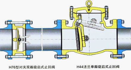 H76W型不锈钢对夹双瓣旋启式止回阀、H76H型碳钢对夹双瓣旋启式止回阀。